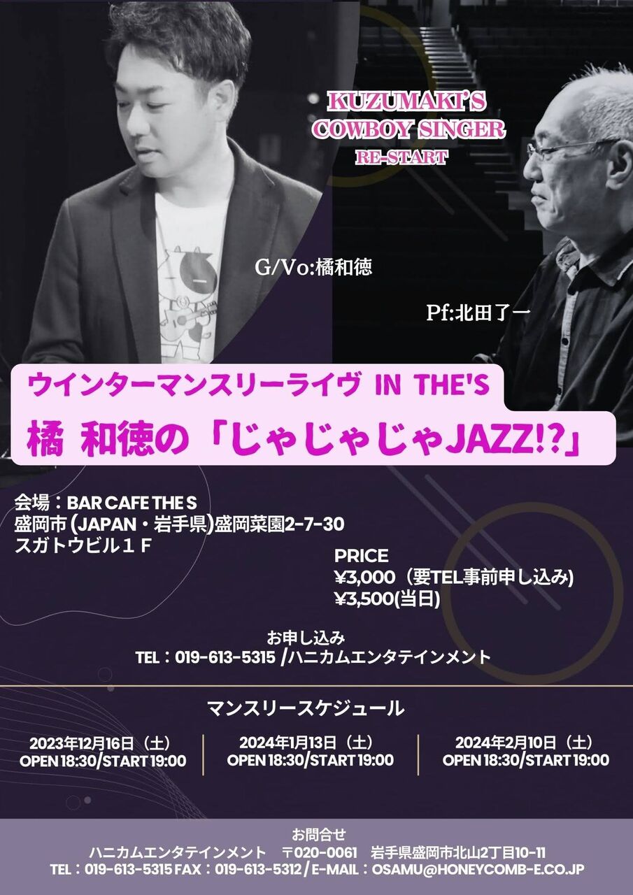 2023年12月02日 ウインターマンスリーライヴ IN THE'S 橘和徳くんを中心としたJAZZ Pojectは、酪農業の比較的閑散期である冬場に活動することにしました。 2023年12月16日、2024年1月13日、2月10日の3公演でJAZZ修行してもらいます😁会場はデビュー当時苦い思い出のある、盛岡菜園のBAR CAFE THE S。リベンジを気す橘である😁今回は雫石のイベントでご一緒したバイオリンシンガーの「絵美夏さん」をシークレットゲストに迎える予定です。ワクワクしかありません! by平野 タグ :#jajajajazz#じゃじゃじゃJAZZ#橘和徳#絵美夏#北田了一#ハニカムエンタテインメント